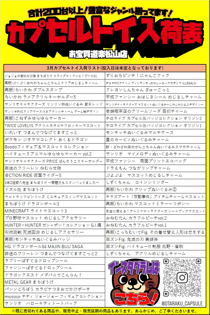 カプセルトイ3月分の入荷予定表を作成しました! 投入日は未定です…