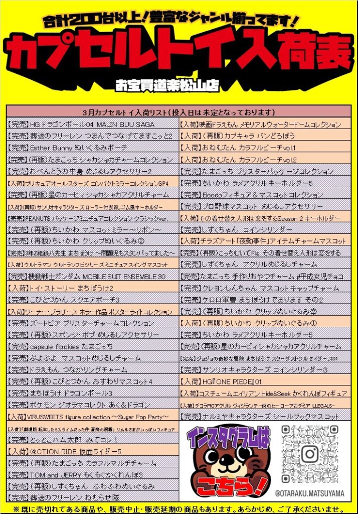 カプセルトイ3月分の入荷予定表を更新しました!★ 投入日は未定です…